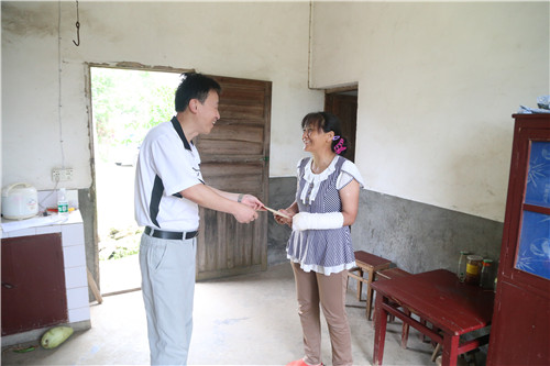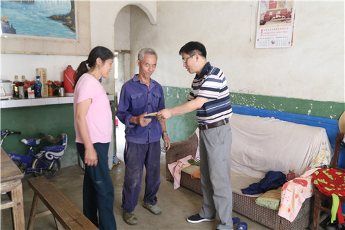 在枫树村,院领导分别前往9户结对帮扶对象家中进行走访慰问,分别将3000元慰问金送到他们手中。这9户帮扶对象是该村部扶贫攻坚工作的“建档立卡户”,均为因病致贫,院领导充分结合自身医疗资源优势,对他们进行了一对一结对帮扶。在他们家中,院领导详细了解了他们的身体状况,询问了他们各自的扶贫第一书记,扶贫主任以及扶贫政策中得到的实惠等情况。同时向他们宣教了临床医学院/附属医院健康扶贫的相关政策,鼓励他们重拾对美好生活的信心,受到关怀的村民感动不已,连连道谢。